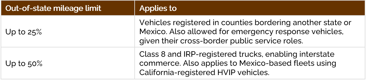 Despite these allowances, the majority of vehicle use must remain within California during the compliance period. Exceeding these limits risks non- compliance, clawback of voucher funds, and loss of eligibility for future incentives.